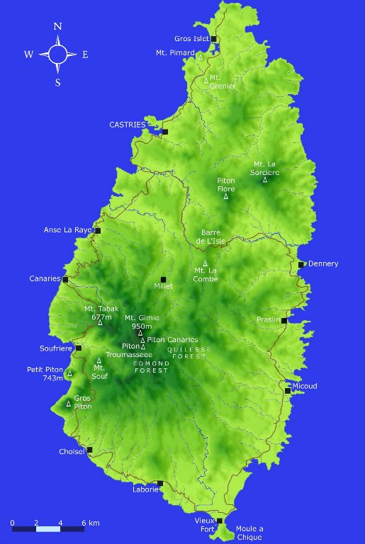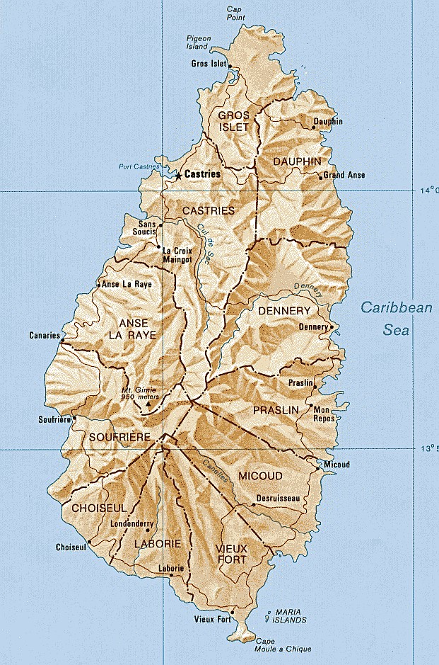 showing location of Saint Lucia but many names within Saint Lucia are incorrect.